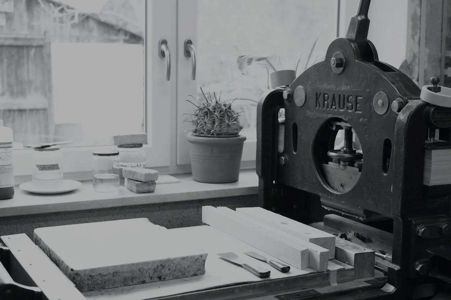 Die Materialität des Druckstocks aus Stein, Kupfer oder Holz und dessen Bearbeitung ist wie Bildhauerei im ganz kleinen Maßstab, mit feinen Werkzeugen - ganz ruhig, fast meditativ.